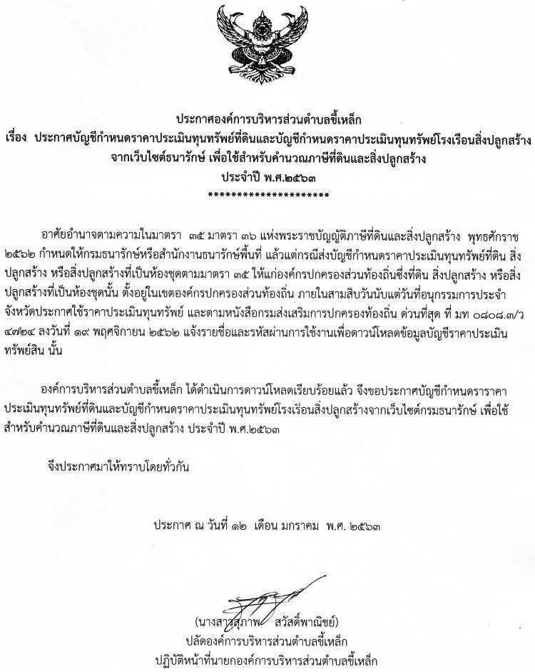 ชื่อเรื่อง : ประกาศ บัญชีกำหนดราคาประเมินทุนทรัพยืที่ดินและบัญชีกำหนดราคาประเมินทุนทรัพย์โรงเรือนสิ่งปลูกร้างจากเว็บไซต์ธนารักษ์ เพื่อใช้สำหหรับคำนวณภาษีที่ดิน และสิ่งปลูกสร้าง ประจำปี พ.ศ.2563