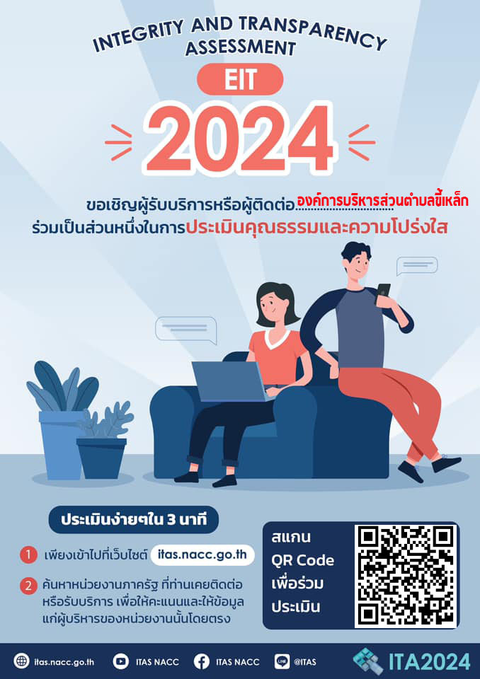 รายละเอียด : องค์การบริหารส่วนตำบลขี้เหล็ก ขอเชิญชวนประชาชนและผู้มาติดต่อราชการ ร่วมแสดงความคิดเห็นและตอบแบบประเมินคุณธรรมและความโปร่งใส ผ่านระบบ ITAS ด้วยตนเองได้ที่ลิ้งค์ https://itas.nacc.go.th/go/eit/iivn33 หรือแสกนคิวอาร์โค้ด (ตามคิวอาร์โค้ดด้านล่าง) ได้ตั้งแต่บัดนี้ จนถึง วันที่ 1 กรกฎาคม 2567 เพื่อนำผลการประเมินไปปรับปรุง พัฒนา และยกระดับการปฏิบัติงาน อันจะส่งผลให้เกิดธรรมาภิบาลในหน่วยงานภาครัฐ และสร้างความโปร่งใสในการปฏิบัติงาน